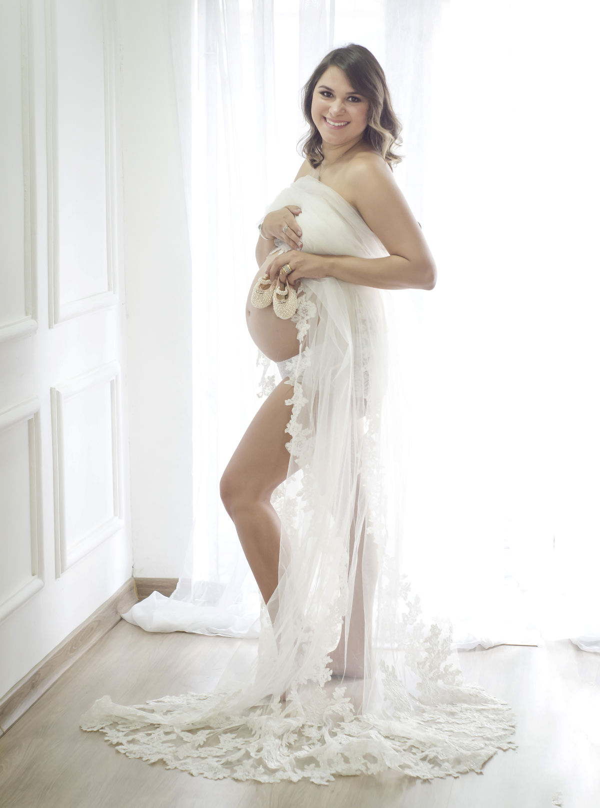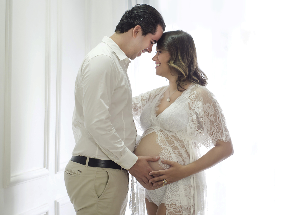 E cada acessório utilizado no ensaio tem um significado especial para eles. Seu véu e tiara de noiva, o terço do casamento, seu robbie foi do enxoval de lua de mel, e as injeções clexane que ela aplica todos os dias para que a Maria Catarina continue lá firme e forte. Objetos com significado!